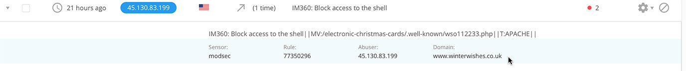 Similarly, on my other VPS I see IM360: Block access to shell which references a url/file which I don't believe exists: MV:/electronic-christmas-cards/.well-known/wso112233.php. Is this just them looking for known dodgy files that could be there, rather than them actually being in its?