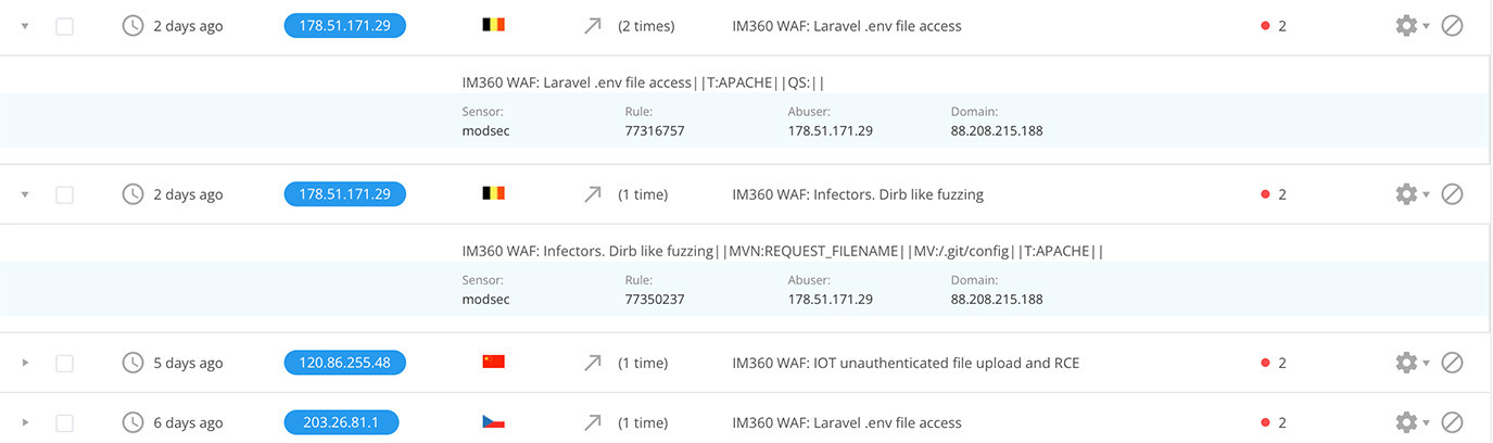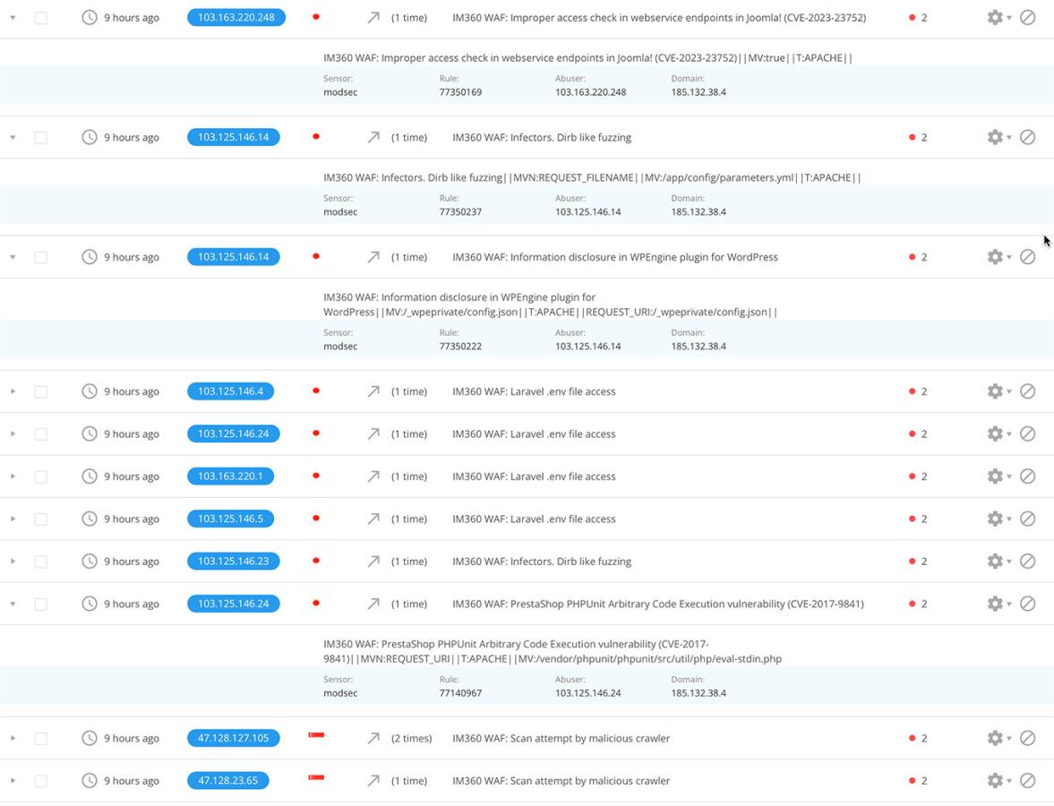 EG I'll see a notification about Joomla, WordPress or Lavarel but there are non sites of this type on my server. I've attached a screen grab of an example of these notifications (eg IM360 WAF: Lavarel .env file access, and IM360 WAF: Infectors. Dirb like fuzzing).