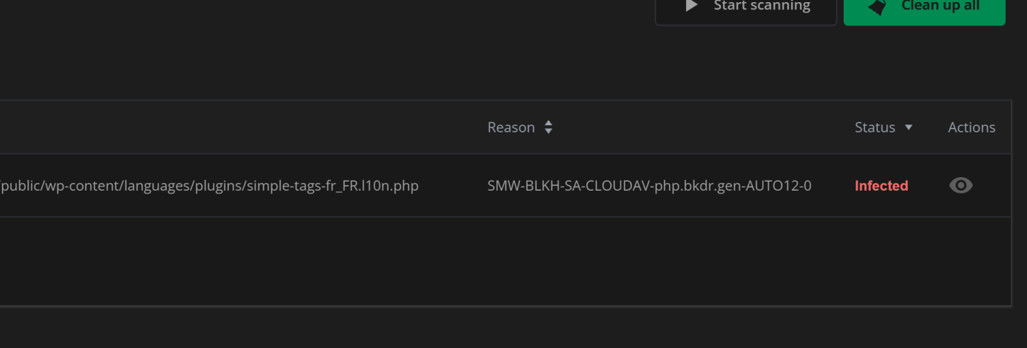 Recently, I received a message from my hosting that my site was suspended because they found a virus and said to check the page with imunifyAV in plesk, and there was this: public/wp-content/languages/plugins/simple-tags-fr_FR.l10n.php
